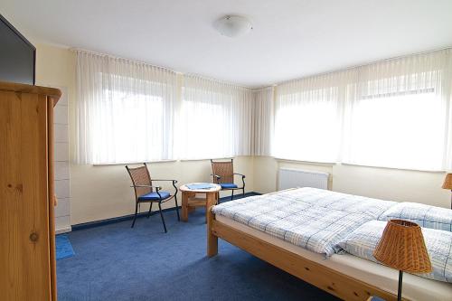 Die Zimmer im Hotel Schönfeld sind einfach eingerichtet. Sie verfügen über einen TV und einen Kleiderschrank. Handtücher und Bettwäsche werden gestellt. Sie haben Zugang zu den Gemeinschaftsbädern und zu den Duschen auf dem Flur.