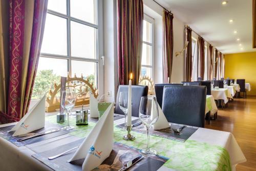 Im Restaurant im Berghotel Wettiner Höhe werden traditionelle Gerichte der deutschen Küche und sächsische Spezialitäten serviert. Eine Auswahl an Weinen wird ebenfalls angeboten.